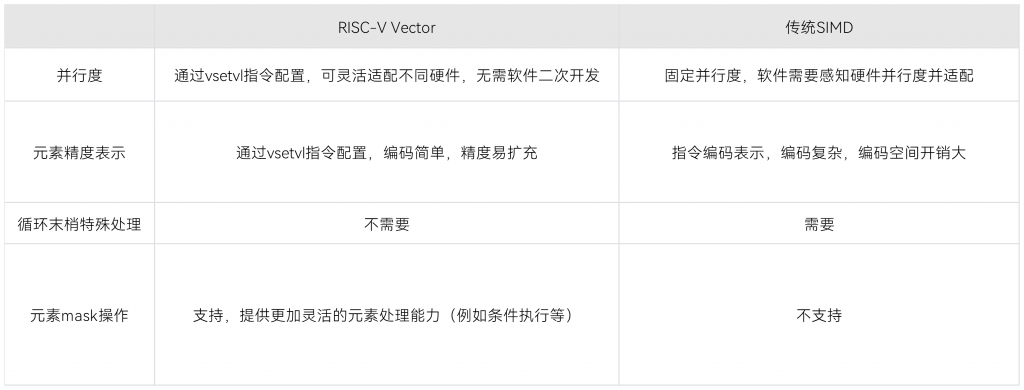 相较于传统 SIMD 指令,RISC-V 指令集向量扩展 RISC-V Vector 采用了更加灵活的编程模型,在提供单指令多数据并行处理的同时,为开发者提供了更高层次的抽象,使得软硬件更加解耦,软件无需感知硬件并行度的变化,直接适配于不同的硬件配置。