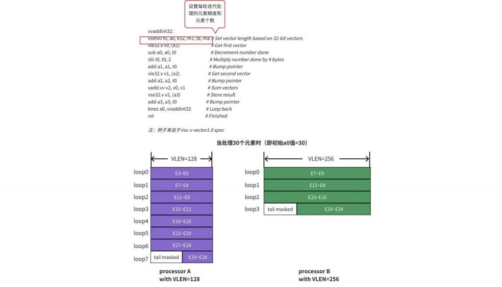 我们以 RISC-V Vector1.0 指令集为例。从图中可以看到,对于向量寄存器宽度( VLEN )不同的硬件,同一套程序可以直接运行,唯一区别是 VLEN 越大的处理器每轮迭代所能够处理的元素个数越多,因此所需要的循环次数越少。此外,由于指令集所定义的element mask功能,在最后一轮迭代时,超出的元素将被无效掉,而无需类似 SIMD 指令那样对循环末梢的元素进行额外的特殊处理。