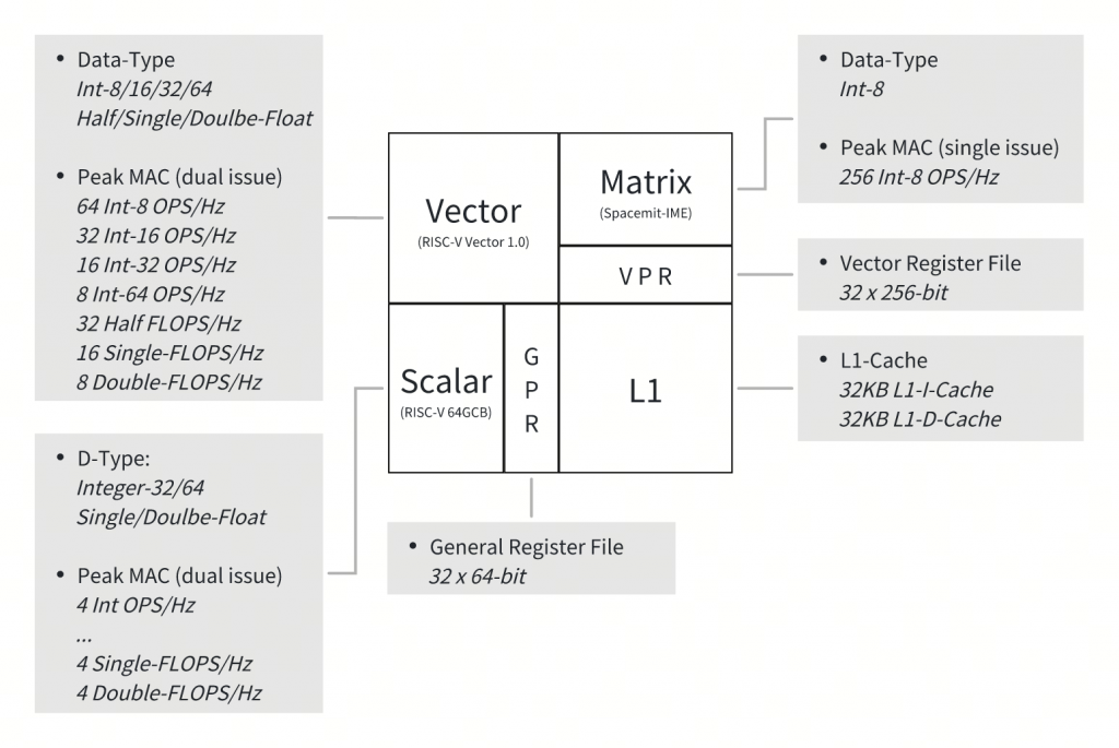 进迭时空第一代 RISC-V CPU核X60 和 RISC-V AI核 A60 已完整支持 RISC-V Vector 1.0 扩展,并应用于RISC-V AI CPU芯片 K1 中。该系列核支持 VLEN=256-bit 的向量寄存器宽度,提供最大 2×128-bit 的数据并行处理能力,支持 INT/FP 等多种计算精度。同时,A60 还基于向量寄存器扩展了符合 IME 标准的 AI 指令,提供 2Tops INT8 融合AI算力。