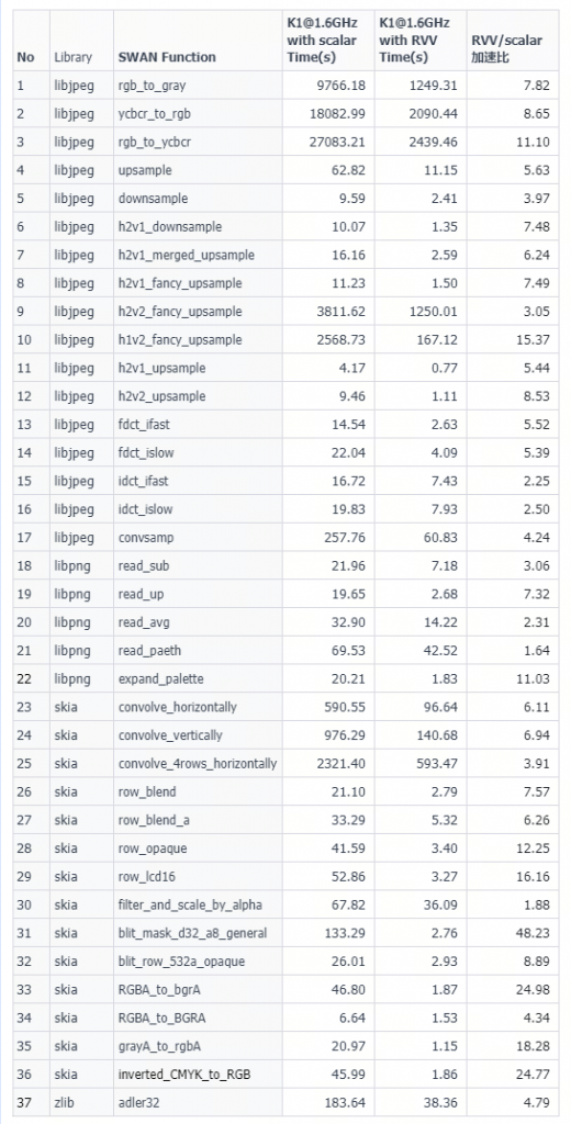 我们基于 SWAN 测试集对 K1 的向量能力进行了测试和优化。SWAN 是一套用于测试向量指令在多媒体、图像处理等数据密集型应用中性能表现的基准测试集,其针对 chromium、WebRTC、PDFium 等应用的软件库进行性能分析,测试涵盖了图像编解码、卷积计算、色彩空间转换等典型算法。