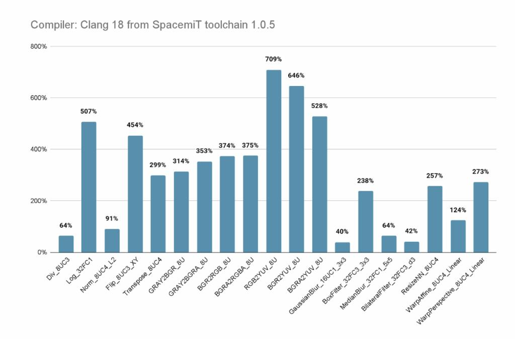 opencv 是最具影响力的机器视觉开源工程。今年进迭时空和 opencv 社区进行合作,基于进迭时空的RISC-V AI CPU芯片K1,优化了 opencv 的基础视觉算法在RISC-V vector1.0 的性能,取得了显著的性能提升,平均性能提升超过200%,相关代码都已经合入主支。