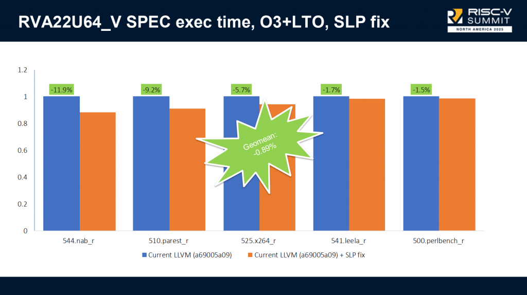 Mikhail 在报告中重点分析了跨函数调用这一典型场景。最终落地的 SLP fix 方案取得了显著优化效果,在测试中实现单个用例最高11.9%的性能提升,整体平均提升幅度也接近 1%。