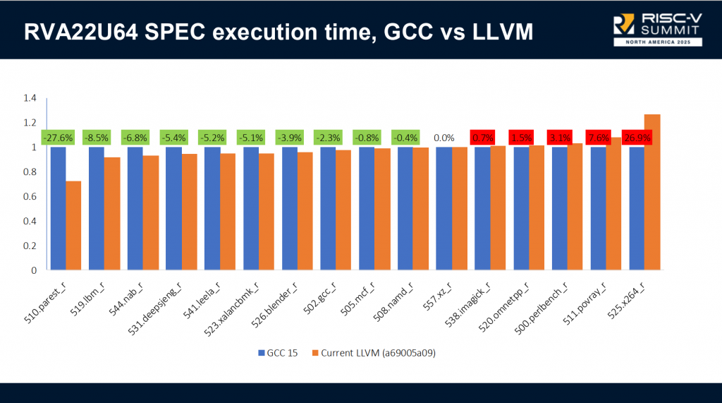 从报告展示的最终数据来看,当前 GCC 与 LLVM 两大开源编译器在 RISC-V 平台上的表现各有优势,在不同测试项目中互有领先,这也表明未来仍有广阔的协同优化空间。