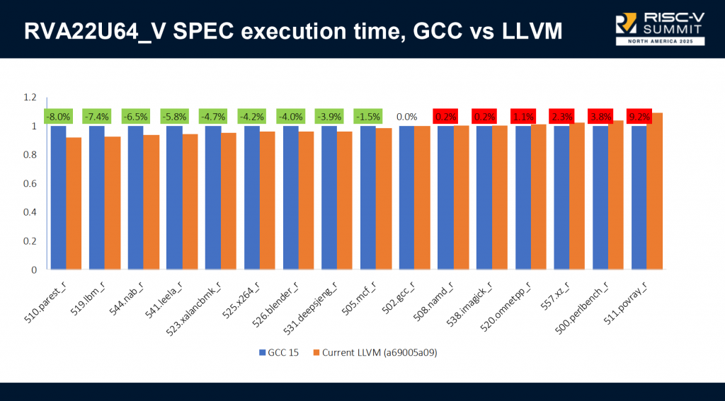2025年10月,在北美RISC-V峰会上,Igalia编译器工程师Mikhail发表专题演讲《Unlocking 15% More Performance: A Case Study in LLVM Optimization for RISC-V》。演讲基于在进迭时空 SpacemiT-X60 RISC-V 处理器上开展的十个月优化实践,系统阐述如何通过上游 LLVM 的多项改进,显著提升 RISC-V 处理器性能,并在 SPEC CPU® 2017 基准测试中实现最高达 16% 的性能提升。