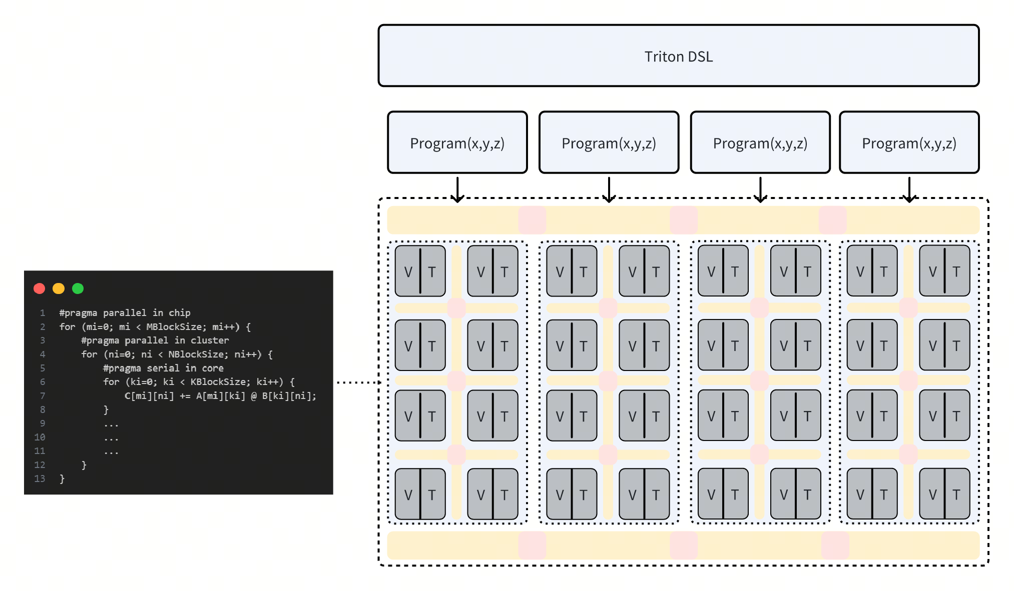 常见的 Host-Device 的异构 Triton 方案,使得 Triton 算子编程的调试困难,内存模型复杂,不利于开发者灵活的实现自己的想法,而搭建于传统 CPU 之上的 Triton-CPU 方案,也缺乏在AI高性能计算上的硬件支持,例如核内 TensorCore、多核通信与访存优化、多卡互联等。