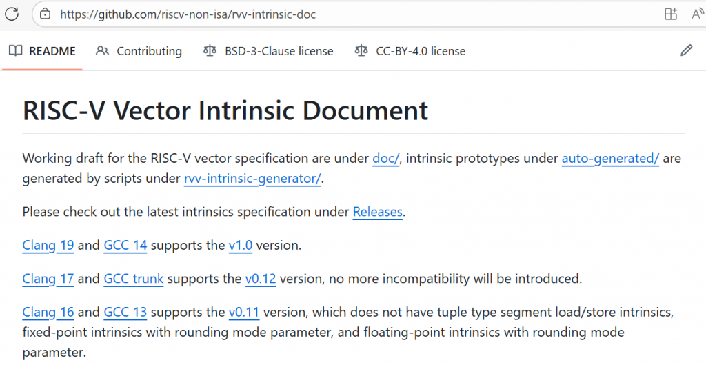 RVV 扩展指令虽已于 2021 年发布 v1.0 ratify 版本,但在实际开发中,除了直接使用汇编代码外,开发者更常借助更为便捷的 intrinsic 编程接口。RVV intrinsic 接口历经 v0.11、v0.12 版本,于 2025 年 4 月发布 v1.0 ratify 版本,对应的编译器版本也是逐步完善。